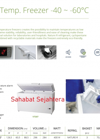 Freezer suhu ultra rendah Vt beroperasi pada range suhu -40 hingga -60°C. dengan stabilitas yang tinggi, material yang dapat didaur ulang serta kemudahan penggunaan dan pembersihan, menjadikan freezer ini solusi yang ideal dan ramah linkungan untuk laboratorium dan rumah sakit.